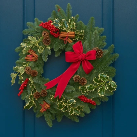A classic, timeless wreath designed to bring true Christmas warmth to your doorway. Each piece is handmade on a base of sustainably sourced Noble Fir, chosen for its full shape, rich colour and excellent needle-hold. We layer in variegated holly stems for a traditional burst of shine and contrast, then finish with a hand-tied red velvet bow for a luxurious, festive touch. The look is completed with a curated mix of decorative accents, including artificial red berry clusters, bundles of cinnamon sticks, and natural pinecones—a perfect balance of colour, fragrance and texture.